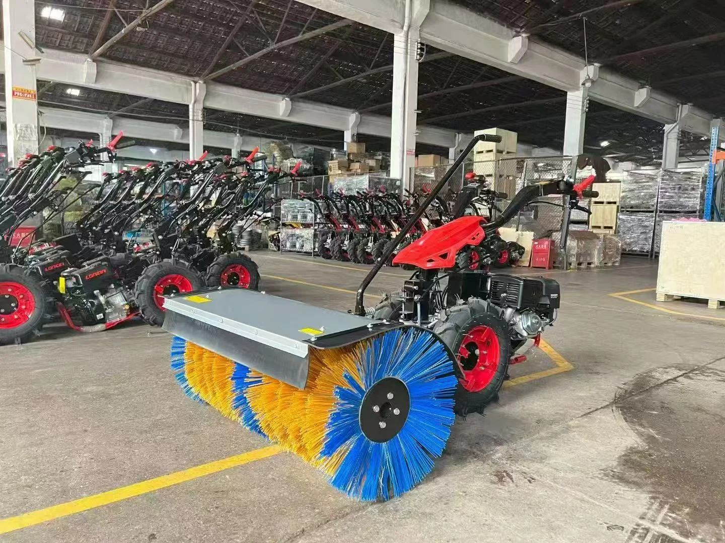 With a 110cm working width and 50cm nylon steel wire brush, the machine can quickly clear snow, slush, dust, and debris. The toothed gear drive system ensures stable operation and high durability, while the electric start makes it easy to use in cold conditions.